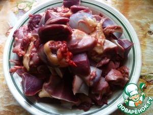 Я обрезала мякоть с гуся и немного мяса на кости взяла, порубила. Также взяла 2 пупа гусиных и два сердца.