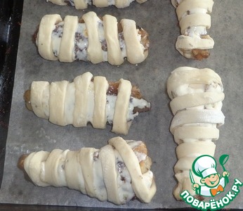 Тесто разрезаем на полоски шириной 1 см. Каждое крылышко смазываем сметаной и вокруг оборачиваем тестом, чтобы получилась спираль.