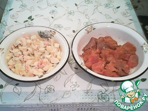 Готовим рыбу – очищаем от кожи, нарезаем кусочками грамм по 100-150, Готовим овощи – нарезаем кубиком и готовим специи.