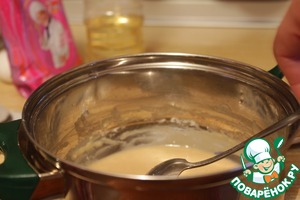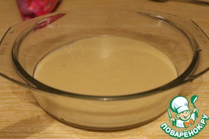 Блендера у меня нет, наверно, с ним будет удобнее и быстрее, но я готовлю вручную. В небольшой кастрюльке смешиваем 1 яйцо, 0,5 ч. л. разрыхлителя (если нужно бисквит повоздушней, то добавьте побольше, я люблю немножко плотную консистенцию), 3 ст. л. сахара (без горки), 4 ст. л. муки, 5 ст. л. молока, 3 ст. л. кунжутной пасты. Если паста густая, то пасты берем 2 ст. л. и 6 ст. л. молока.