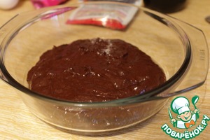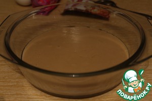 Третья часть: смешиваем 1 яйцо, 0,5 ч. л. разрыхлителя, 3 ст. л. сахара (без горки), 4 ст. л. муки, 11 ст. л. молока, 4 ст. л. какао-порошка (прям с небольшими горками), 3 ст. л. растительного масла. Выпекаем. Примечание: получается очень шоколадно и масса по консистенции более густая, чем предыдущие. Бисквитик легко рассыпается, но в конечном итоге мне это и необходимо. При выпечке для тортов я молока беру 5 ст. л. и пол ложки какао, либо 2 ч. л. кофе разводим 5 с. л. горячей воды или молока.