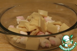 Плитку шоколада (в данном случае белого) и 40г. маршмеллоу ломаем и рвем на кусочки, кладем в миску, добавляем 5 ч. л. воды, разогреваем в микроволновой печи примерно 1 минуту 20 сек. при мощности 450Вт. Затем добавляем необходимое количество пищевого красителя.