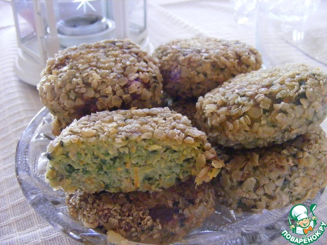 Формируем небольшие котлетки, обваливаем их в овсяных хлопьях.