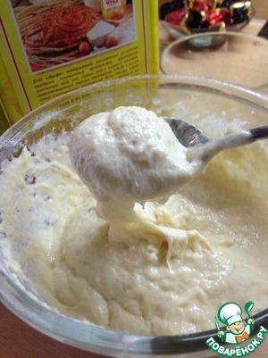 Затем постепенно добавлять муку. Надо, чтобы получилась смесь, которая не стекает, а сходит с ложки тягучей массой. Размешать тщательно без комочков. И только теперь добавить гашеную соду. Еще раз все перемешать.