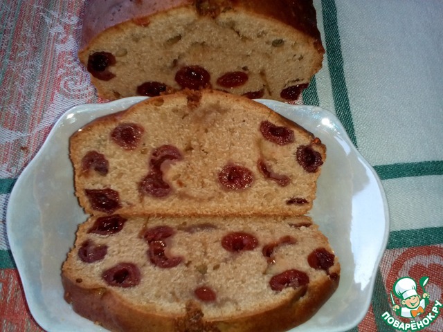 Вишню откинуть на сито, сироп собрать. Вишню смешать с тестом. Выложить в смазанную маслом форму. Выпекать t=180~200°C минут 30.