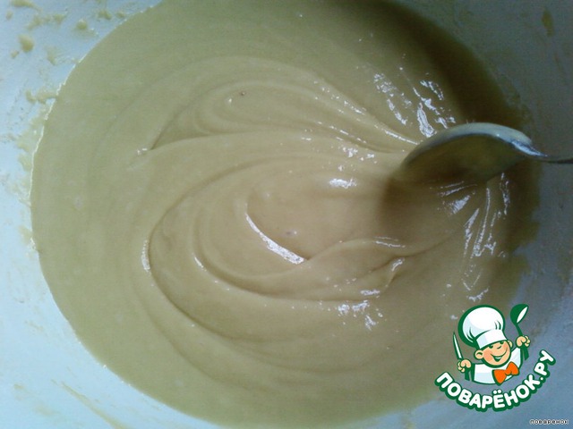 Добавить молоко и размешать, чтобы тесто приняло такой вид. Форму смазать маслом, посыпать сухарями.