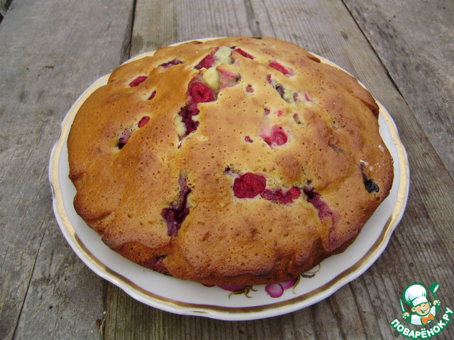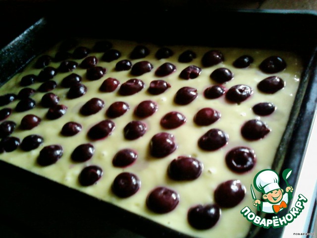 Вылить тесто в форму, распределив. Сверху выложить вишни. Я предварительно чуть-чуть посыпала их крахмалом, чтобы сок не так вытекал при запекании.