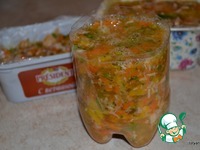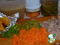 Выкладываем массу не плотно в формы. Я буду добавлять в одно желе соус брусничный D'arbo. Поэтому, одну форму я наполнила всего на половину. Заливаем бульоном с желатином и ставим в холодильник. |