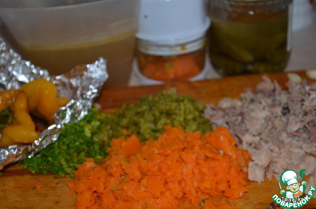 Вынимаем овощи и мясо из бульона. Мясо отбираем от костей. Лук выбрасываем. Морковь, огурчики, зелень и перцы измельчаем очень мелко. У меня с этим справился маленький Ваня, вооруженный "чопером" минут за 7.