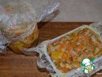 Овощи с мясом перемешиваем, бульон хорошо подсолить и поперчить. Формы слегка смачиваем и выстилаем пищевой пленкой. |