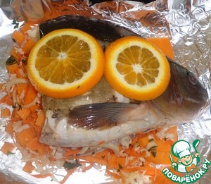 Рыба, запеченная в фольге с овощной начинкой и апельсиновыми дольками.