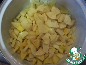 Приготовить большую кастрюлю, в нее мы будем складывать все ингредиенты. Картофель очистить, нарезать крупными ломтиками.