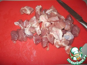 Также, ломтиками, нарезаем свинину. И кладем в кастрюлю вместе с картошкой.