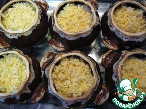 Разложить по горшочкам. Полить сметаной и посыпать натертым на крупной терке сыром. В каждый горшочек добавить немного водички. Закрыть крышкой. Духовку нагреть до 200 градусов, запекать 40 минут.