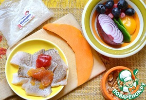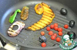 Красный лук, болгарский перец, тыкву выложить на сковородку гриль. Сбрызнуть маслом, обжарить с двух сторон. На последней минуте добавить несколько ягод красной смородины и винограда.