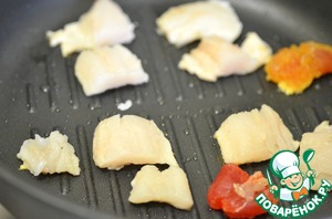 На место обжаренных овощей и ягод положить кусочки филе рыбы и икры. Обжарить с двух сторон по 2 минуты.