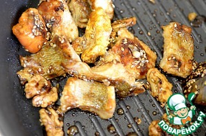 Всыпать кунжут и грецкие орехи, быстро перемешать. Влить соевый соус и гранатовый сироп. Сироп с соусом карамелизуются, создавая красивую и вкусную корочку на рыбе. Держать на огне, постоянно помешивая, меньше минуты.