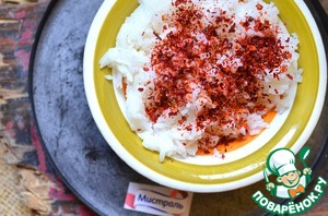 Рис выложить в тарелку, добавить ложку растительного масла и 2/3 ст. ложки сухой сладкой паприки. Размешать. Паприка впитает остатки горячей влаги и придаст рису особый, пикантный вкус.