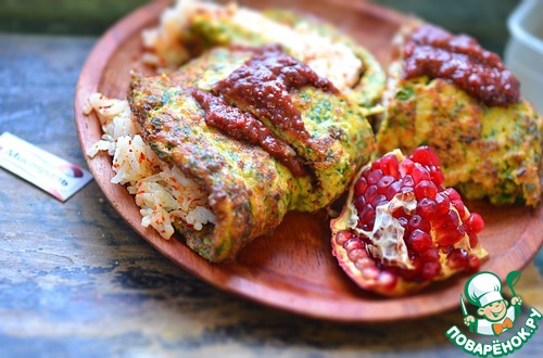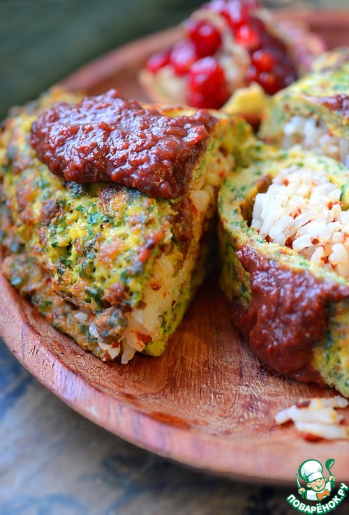 Накрыть второй, свободной стороной. Полить любым соусом. У меня домашний ткемали.