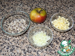 Селедку и лук порезать мелкими кубиками. Перемешать с измельченным луком.