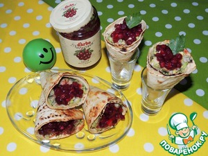 Для подачи в лаваше начинку лучше перемешать. Сверху украсить брусничным соусом.