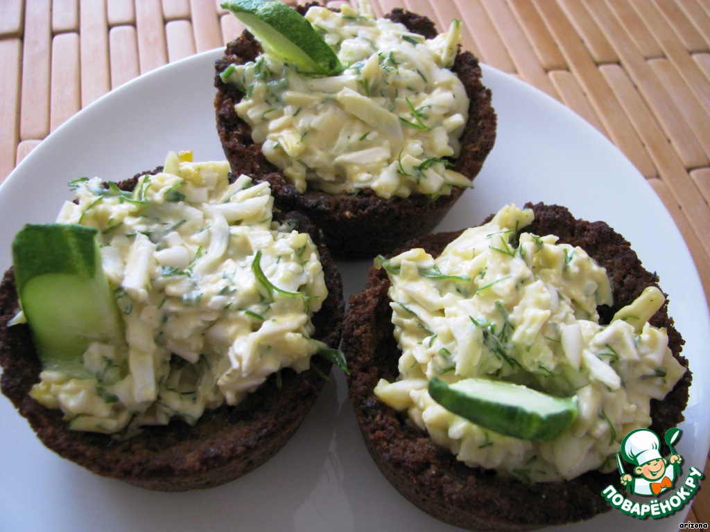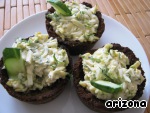 Готовые корзинки можно нафаршировать чем угодно. Любым салатом (у меня, в данном случае, три корзинки с куриным салатом, а две - с ветчиной и сыром.