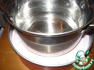 В разъемную форму выкладываем корж и заливаем его цветным кремом так чтобы крем обязательно попал и между формой и бисквитом. Чередуя выкладываем так коржи и крем. На верхних корж сверху ставим посудину с небольшим количеством холодной воды (так быстрее желируется крем сверху) меньшего диаметра, чем сама форма и немного прижимаем, чтобы образовалась ямка. Ждем когда крем схватится.