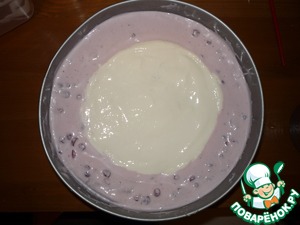 Как только крем сверху схватился. убираем кастрюльку (добавьте в нее горячей воды, она легко отойдет) и в образовавшуюся ямку выкладываем белый крем, выравнивая поверхность торта. Ставим торт в холодильник на несколько часов.