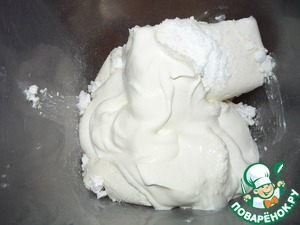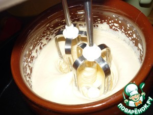 Достаем наши охлажденные белки и начинаем взбивать на маленькой скорости до образования легкой пены. Постепенно начинаем увеличивать скорость и тонкой струйкой всыпаем сахар. Взбиваем до устойчивых пиков. Для удобства взбивания белков можно поместить посуду в ледяную воду. Треть белков перекладываем к желткам и аккуратно перешиваем лопаткой.