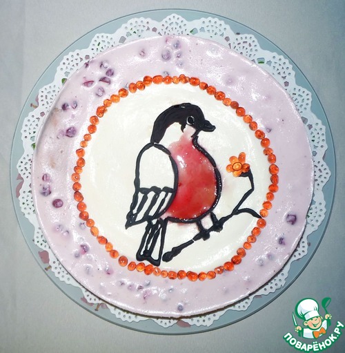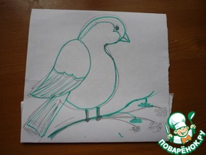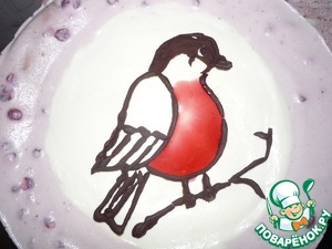 Бумагу для выпечки смазываем сливочным маслом, снизу кладем заготовку птички. Шоколад топим на водяной бане, добавив ложку молока (это не обязательно, но он станет мягче). Перекладываем его в пакет и начинаем рисовать. Готового снегиря убираем в холод. Потом убираем бумагу и перекладываем на торт. Грудку заполняем соусом (без ягод).
