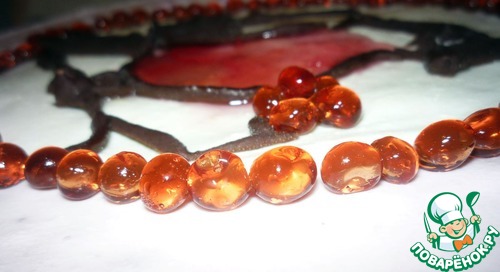 Осталось только сделать ягодки рябинки и торт готов. Стакан с растительным маслом ставим в морозилку до побеления масла. Желатин разводим в части соке и нагреваем. Добавляем остальной сок и оставляем до легкого загустения. Из шприца без иголки по 2-4 капли наливаем в холодное масло. Сок будет медленно опускаться на дно и застывать. Когда половина стакана будет заполнена шариками, процеживаем через сито и промываем их под струей холодной воды. Обсушиваем на салфетки с минуту, перекладываем на тарелку и убираем в холодильник. Потом выкладываем на торт сверху.