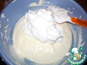 Добавить оставшуюся часть белков и методом складывания аккуратно перемешать тесто, поднимая слой за слоем.