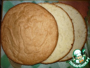 Переложить тесто в форму, смазанную маслом, и выпекать в разогретом духовом шкафу сначала при температуре 180 градусов, а когда бисквит хорошо поднимется, снизить температуру до 160. Общее время выпечки 30-35 минут. Бисквит готов, когда он отошел от стенок формы и при нажатии на него, легко восстанавливает форму. Готовый бисквит лучше всего оставить в горячем духовом шкафу (просто отключив духовку и приоткрыв дверцу) сразу после выпечки дабы он не опал от резкого перепада температур. Остывший бисквит разрезаем на три коржа.