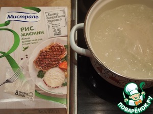 Наливаем в кастрюльку воду, добавляем соль (1/2 ч. л.), ставим на огонь и доводим до кипения. Пакетики с рисом Жасмин кладем в кипящую воду и варим на медленном огне 15 минут.