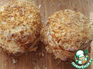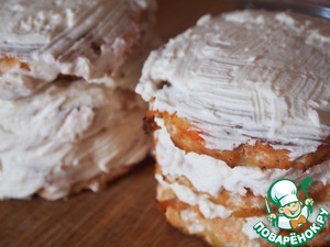 Готовые лепешки выложить на салфетки, чтобы впиталось лишнее масло. Затем соберем тортики. Возьмем одну лепешку, намажем ее рикоттой. Затем накроем второй лепешкой, снова смажем рикоттой и накроем последней лепешкой. Сверху и по бокам промазать рикоттой.