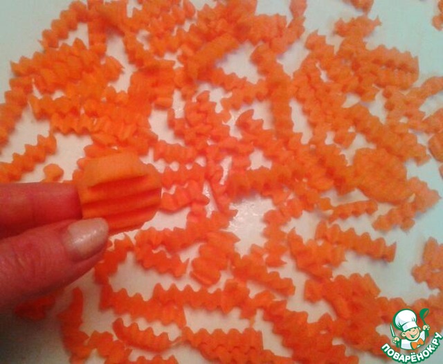 Шинкуем овощ по своему желанию. Можно соломкой, можно нарезать кубиками 1 см / 1 см. Чтобы сделать такую нарезку, я взяла нож для нарезки сыра, разрезала морковь на кружочки, а затем каждый кружочек нашинковала ажурной соломкой.