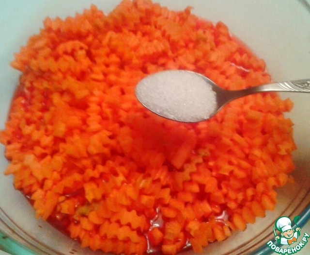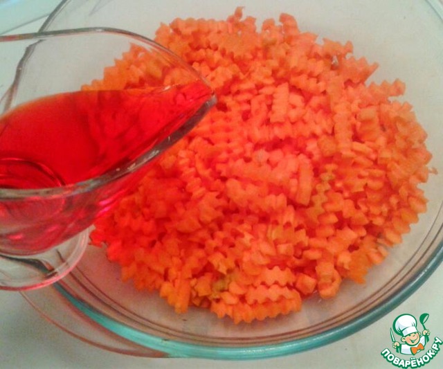 Ягодный сок смешиваем с водой. Нашинкованную морковь выкладываем в кастрюлю и заливаем ягодным раствором. Ставим на средний огонь.