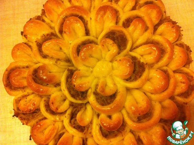 Очень вкусный пирог, оригинальную форму навеял пирог "Хризантема". Пеку часто, вся семья довольна))) В одном пироге может сочетаться несколько начинок, например мои очень любят с мясным и куриным фаршем, рыбкой, сыром или брынзой. А для сладкоежек очень хороший вариант с разным джемом. Тесто очень нежное, универсальное, почти все пирожки делаю на нем))) Так что чуточку фантазии с начинкой и семья СЧАСТЛИВА!)))