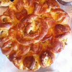 Складываем коружок с начинкой пополам, кончики вытягиваем и защипляем. Выкладываем в смазаную маслом форму по кругу, начиная с внешнего края.