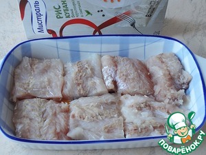 Прежде чем мы займемся приготовлением рыбы, я предлагаю подумать о гарнире. Хорошо к этому блюду подходит отварной рис. Поставим кастрюлю с водой для варки риса и займемся рыбой. Филе хека нарежьте крупными кусками и уложите в форму, предварительно смазанную маслом, посолите. Для этого рецепта годится любая белая рыба.