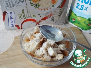 Нарежьте хлеб небольшими кубиками (ломтики квадратные, не половинки), сложите в миску, залейте молоком, добавьте столовую ложку растительного масла, перемешайте.