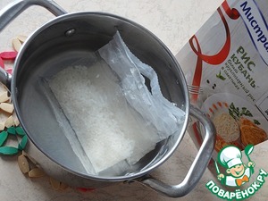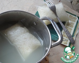 В закипевшую воду опускаем пакетики с рисом. Для этого рецепта я взяла рис Янтарь в варочных пакетиках от ТМ Мистраль. Такой способ приготовления риса очень удобен и прост: не нужно высчитывать соотношение вода/рис, да и рис всегда получается рассыпчатым и неразваренным. На три порции я использую два пакетика. Рис Янтарь варится 25 минут: этого с лихвой хватит на завершение приготовления рыбы. Не забудьте поставить духовку на разогрев (190-200° С)