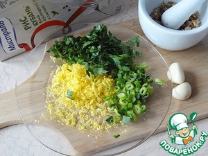 Для заправки натрите цедру лимона, нарежьте зелёный лук и и петрушку, потолките грецкие орехи, измельчите чеснок с помощью пресса.