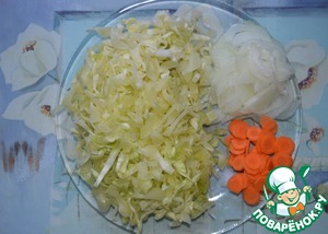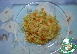 На сковороде разогреть оливковое масло, добавить туда кумин, чуть попозже молотый имбирь и куркуму. Через минуту всыпать в сковороду лук, слегка обжарить. Добавить морковь, через пару минут – капусту. Всё потушить.