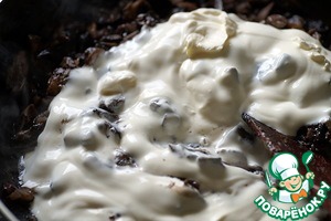 Добавить муку равномерно, перемешать и добавить сметану. Добавить соль, специи по вкусу. Протушить, пока немного загустеет. Оставить остывать.