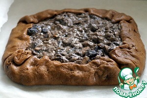Выложить на тесто грибную начинку равномерным слоем так, чтобы края теста были свободными. Загнуть края на начинку и прищипнуть, чтобы они не раскрывались.