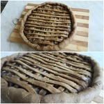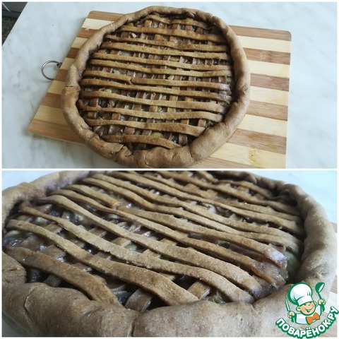 Пирог вместе с бумагой перенести на противень и поставить в разогретую до t=200~220°C духовку примерно на 30 минут.