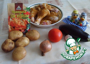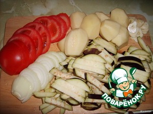 Баклажаны нарезать соломкой, томат, лук и чеснок - кольцами, картофель - пополам.