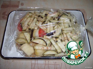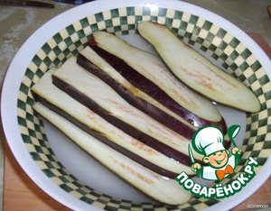 Баклажан нарезать и замочить в воде на 10-15 минут, чтобы избавиться от горечи. Затем слить воду. -