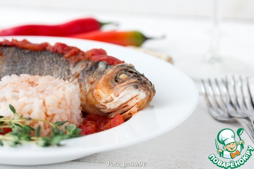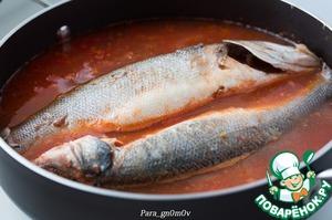 4. Выложить рыбу в соус, потомить с одной стороны около минуты, перевернуть на другую сторону и томить тоже около минуты. Добавить вино, бульон (я использовала воду), смесь перцев, посолить. Накрыть крышкой и томить рыбу около 7-8 минут. Соус должен не кипеть, а чуть-чуть булькать. Затем аккуратно перевернуть рыбу на другую сторону и томить еще 7-8 минут. Проверить готовность рыбы с помощью ножа, аккуратно проткнув ножом у хвоста.